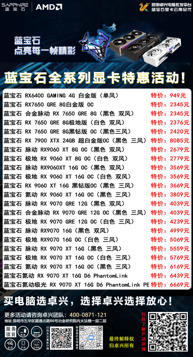 从单一批发到全品类布局,从区域商家到行业标杆,云南卓兴电脑批发平台始终与全球顶尖品牌同行,以蓝宝石显卡为契机,持续优化产品结构、提升服务品质。未来,卓兴将继续坚守初心,依托蓝宝石的顶尖图形显示技术与自身的本地化服务优势,为云南IT市场注入新的活力,为全省经销商、企业及用户提供更优质的产品、更高效的服务、更具竞争力的价格,助力每一位合作伙伴在数字时代抢占先机,共筑云南IT行业的美好未来。