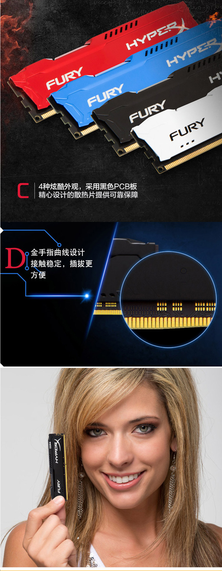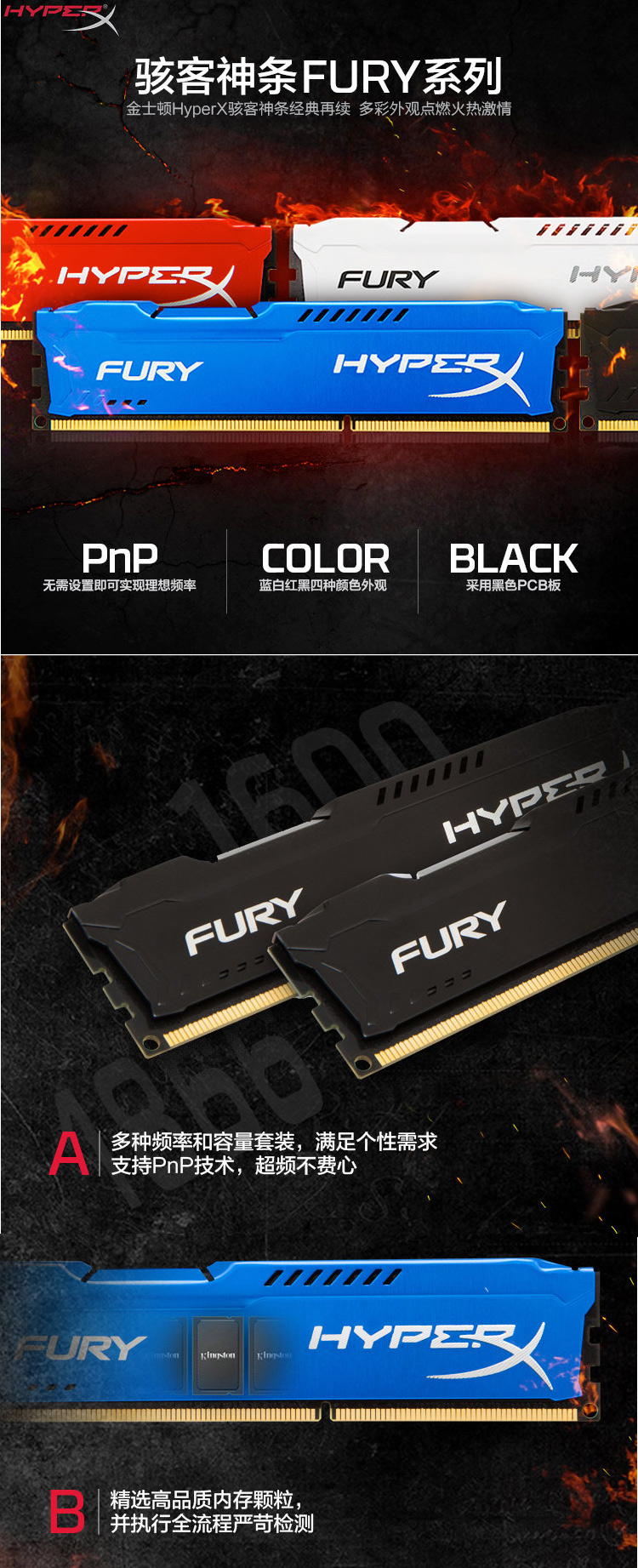 商品名称:HYPERX 金士顿HyperX骇客神条FURY系列DDR3/DDR4 4G/8G/16G台式机内存 骇客神条FURY系列8G DDR3 1866