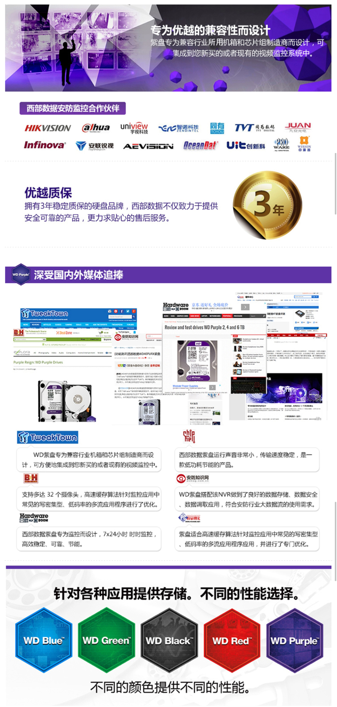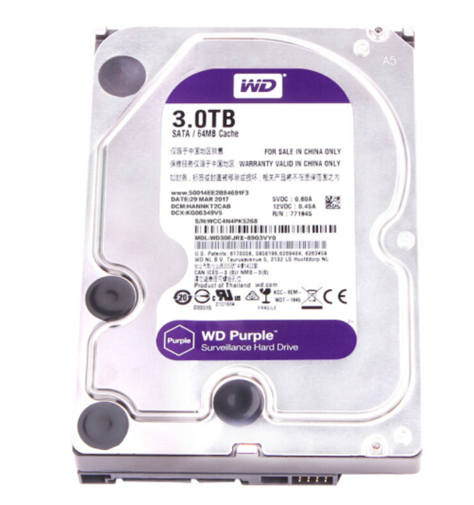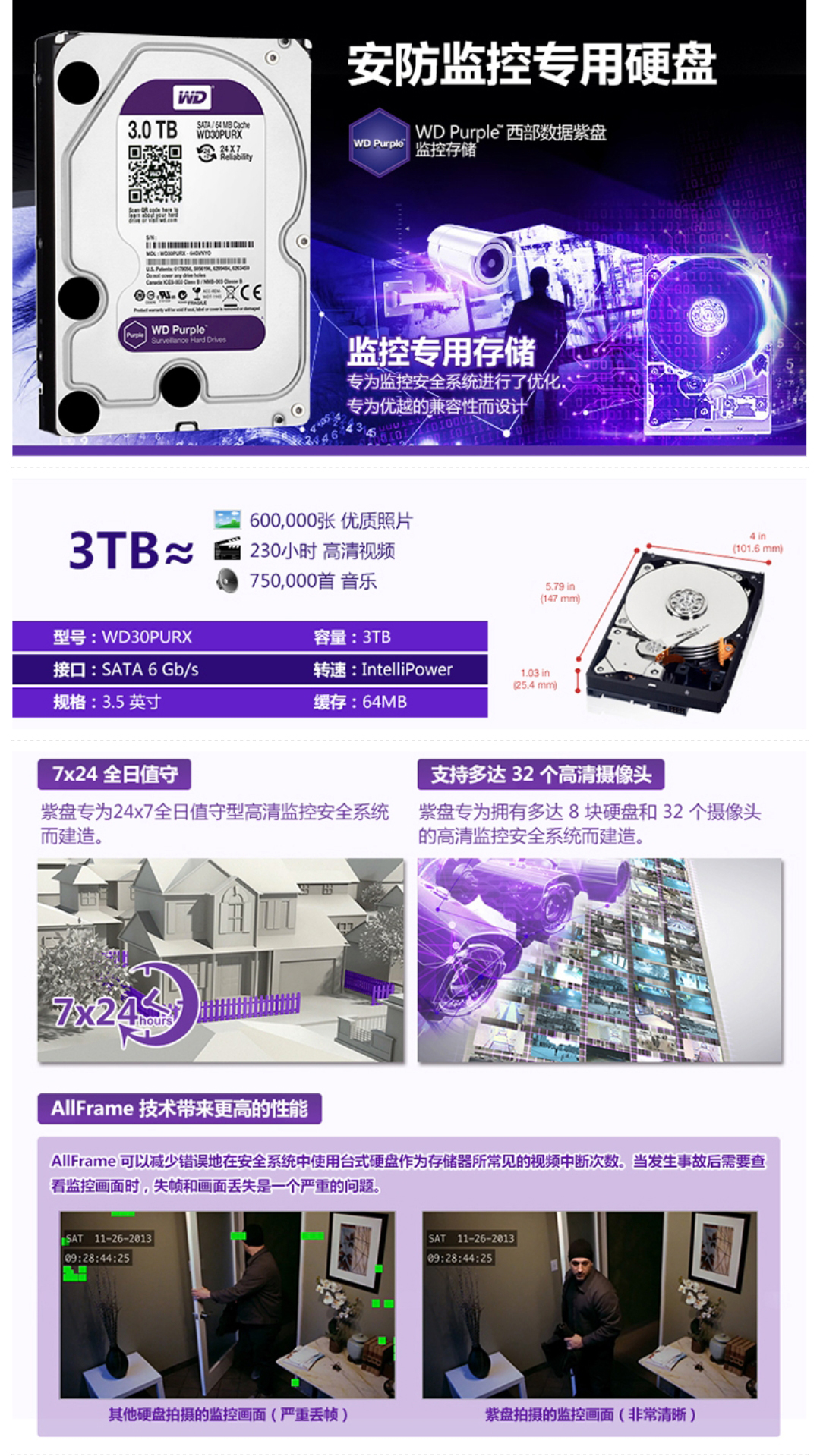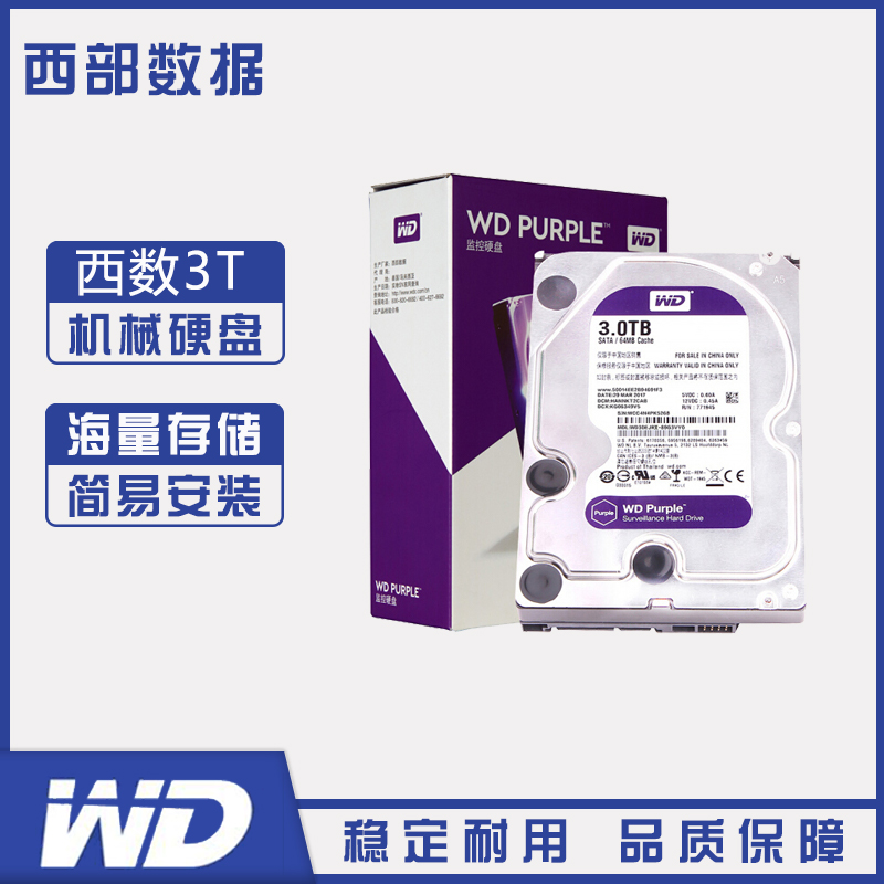 云南电脑批发 西部数据(WD)紫盘 3TB SATA6Gb/s 64M 监控硬盘(WD30PURX)