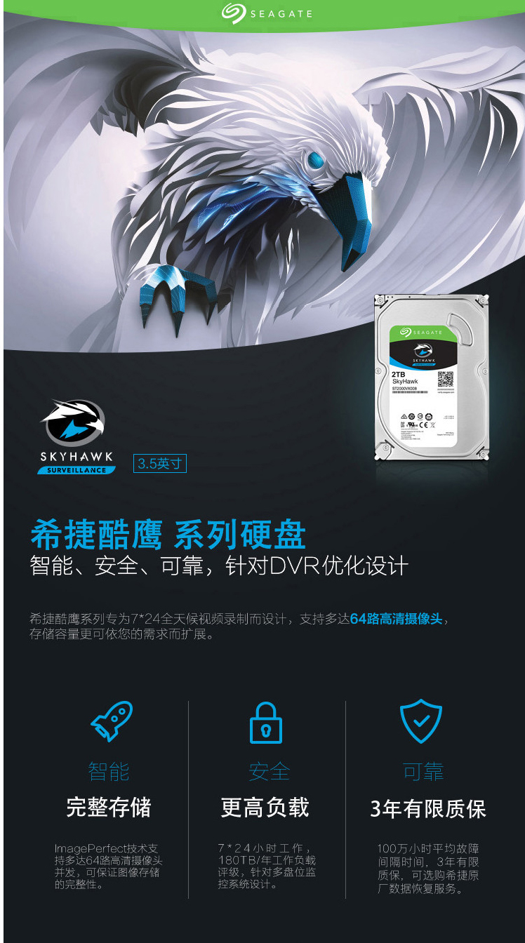 云南硬盘批发 希捷(SEAGATE)酷鹰系列 2TB 5900转64M SATA3 监控级硬盘