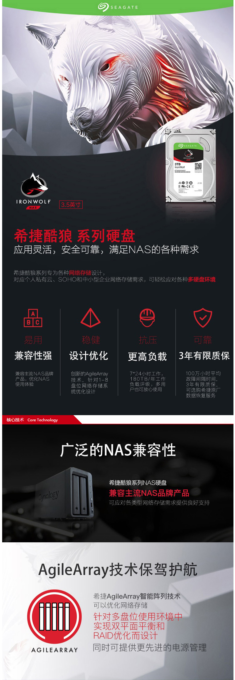 商品名称:希捷(SEAGATE)酷狼系列 3TB 5900转64M SATA3 网络存储(NAS)硬盘(ST3000VN007)