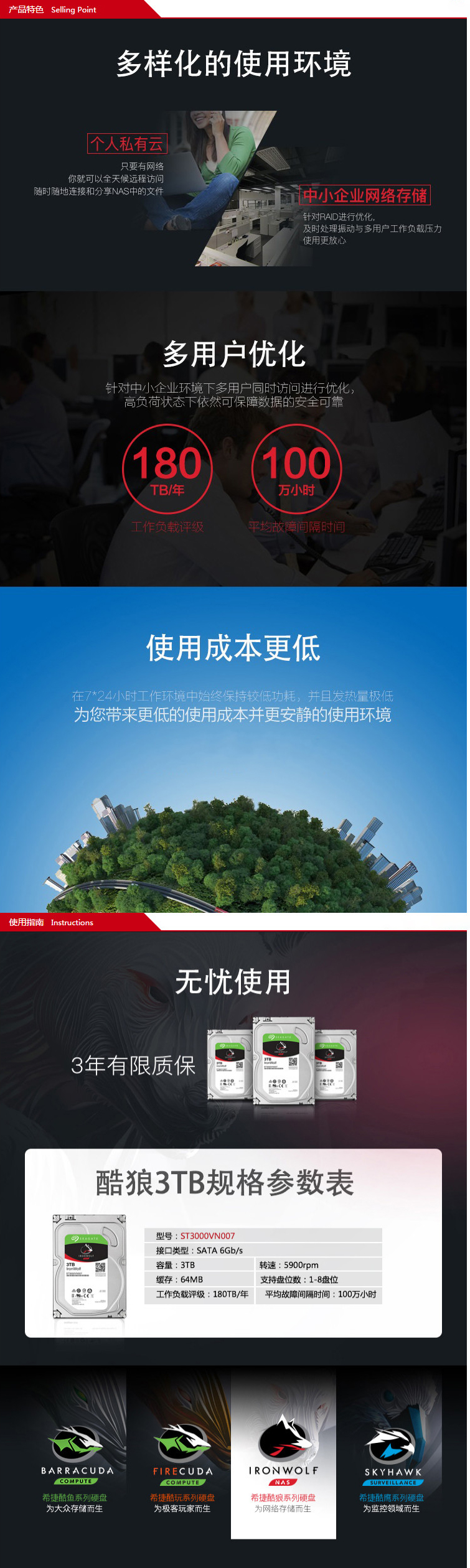 云南硬盘批发 希捷(SEAGATE)酷狼系列 3TB 5900转64M SATA3 网络存储(NAS)硬盘