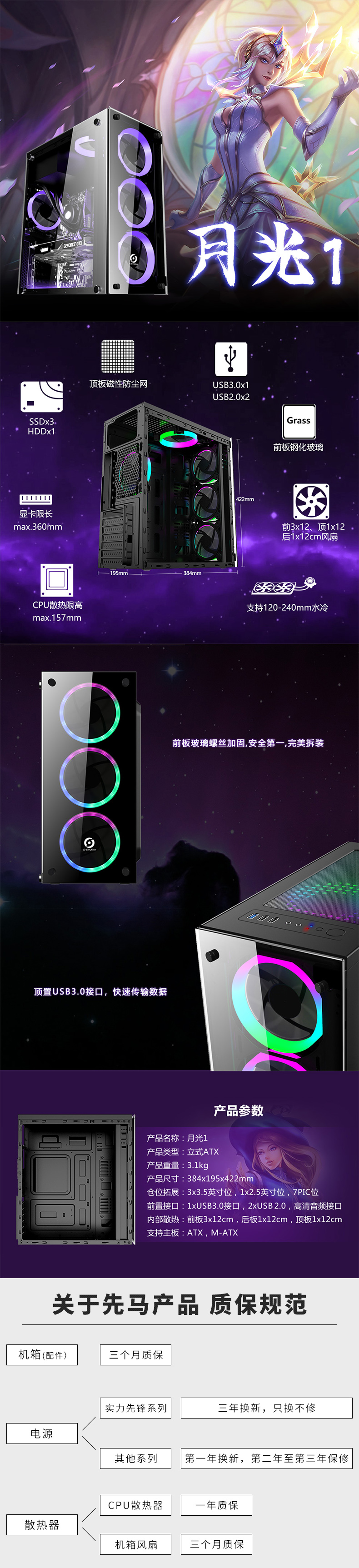 游戏风暴 月光1号 台式电脑机箱 亚克力侧板 支持240水冷atx主板长显卡多风扇位 昆明电脑批发 云南电脑商城