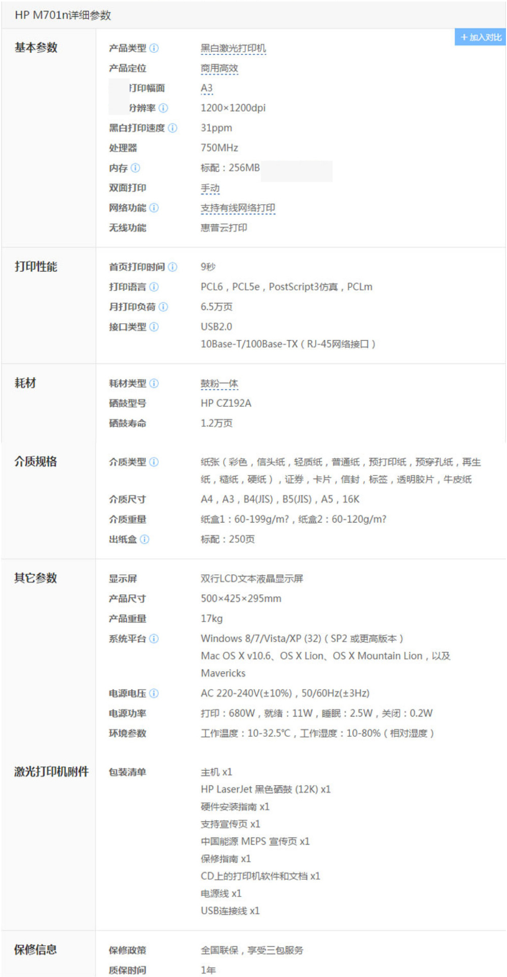惠普(HP) 惠普HP M701n A3黑白激光打印机