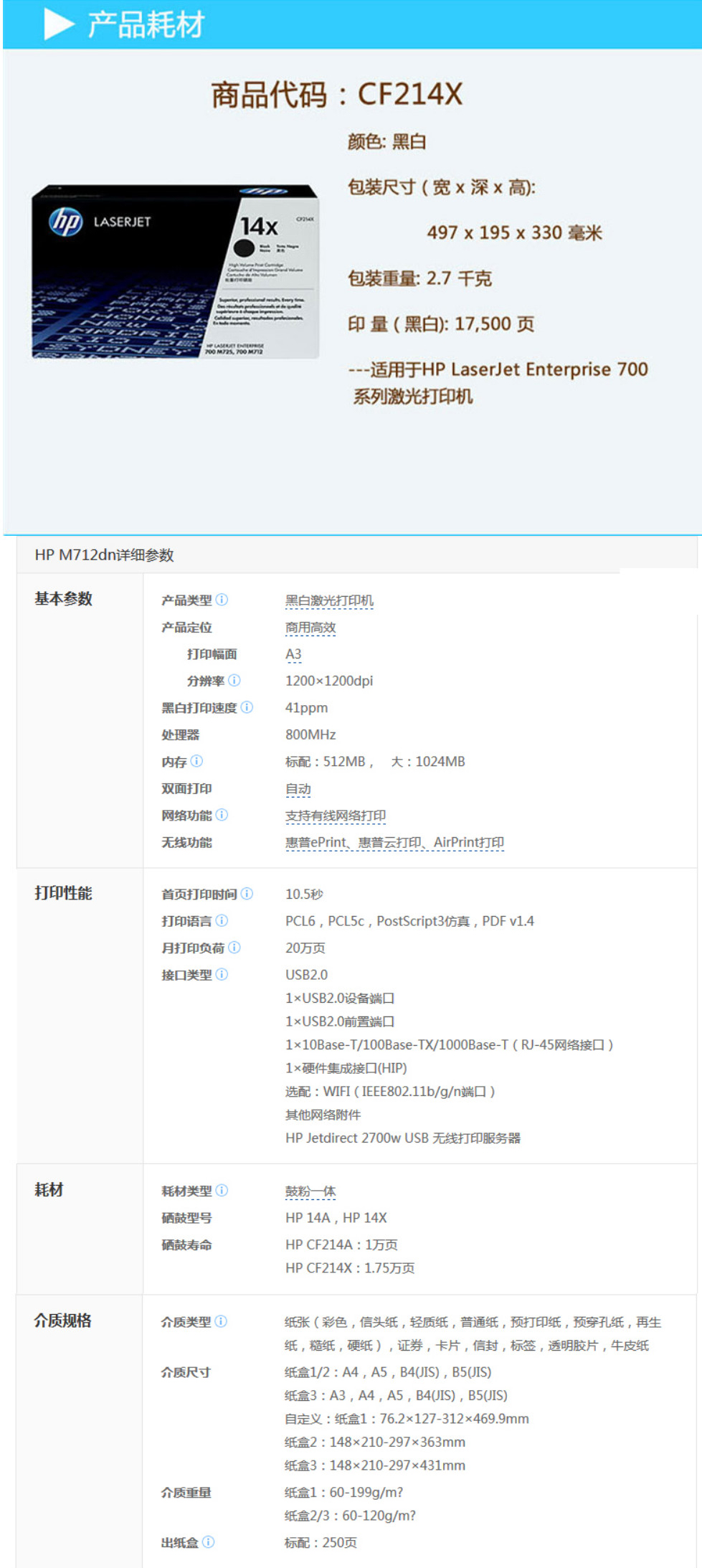 惠普(HP)LaserJet Enterprise M712dn A3黑白激光打印机