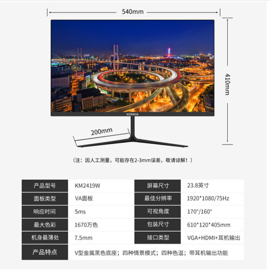品牌: 康佳(KONKA) 商品名称:康佳23.8英寸 三边微边框 低蓝光不闪屏 75HZ 支持壁挂 家用办公电脑液晶显示器 商品毛重:3.5kg 商品产地:中国大陆 面板:VA 屏幕比例:16:9 分辨率:19201080(全高清) 售后服务:3年上门 接口:HDMI,VGA,音频/耳机输出 尺寸:23.5英寸-24英寸 特征:可壁挂 屏刷新率:75HZ