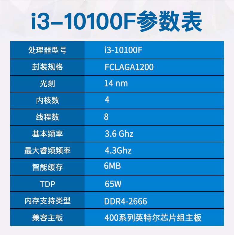 英特尔(Intel)i3-10100F 4核8线程 盒装CPU处理器