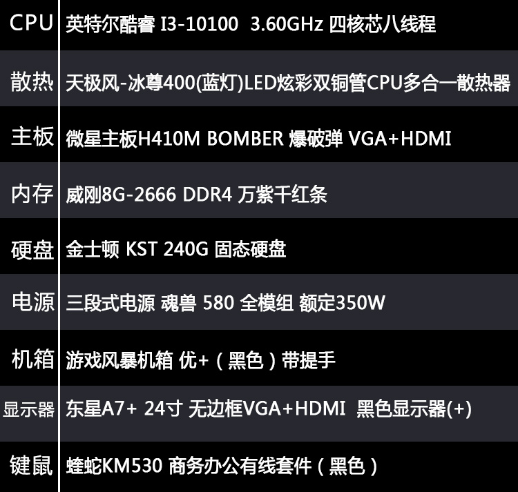 【i3-10100整机】i3-10100/8G内存/240G固态/东星A7+无边框24寸显示器组装