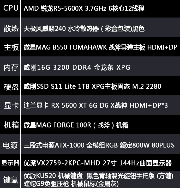 【 R5-5600X整机】AMD 锐龙R5-5600X /16G内存/1T固态/ 27寸2K显示器 游戏电竞整机