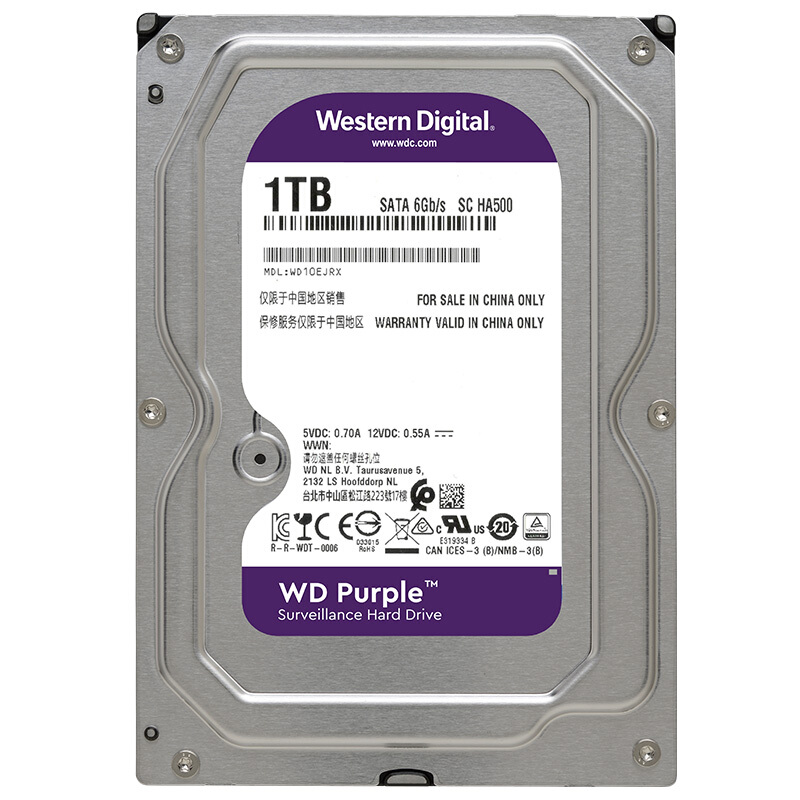 西部数据(WD)紫盘 1TB SATA6Gb/s 64M 监控硬盘(WD10EJRX)
