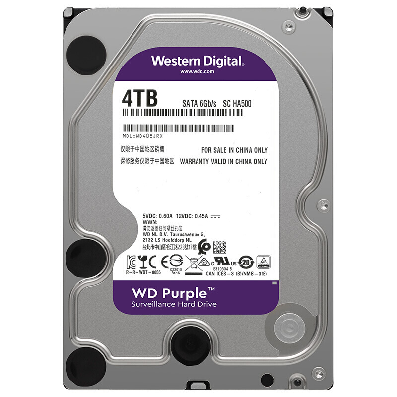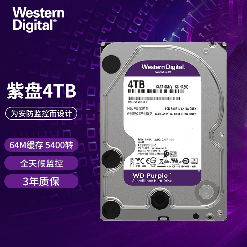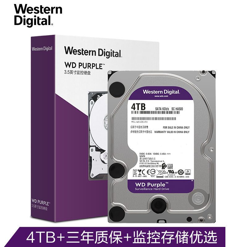 西部数据(WD)紫盘 4TB SATA6Gb/s 64M 监控硬盘(WD40EJRX)