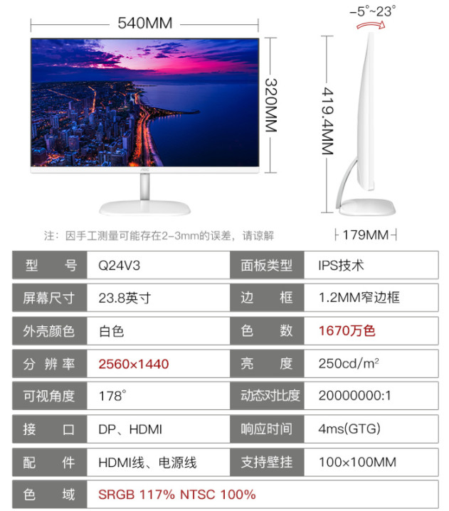 HDMIDCR20,000,000:1DCB,EcoMode,Clear等高清接口及音频输出接口,低蓝光设置,丽比技术,动态对比度高达,活彩技术IPSQHD250nits4msGTG117%sRGB(BT.709)100%NTSCE<2()DP技术,,,,,广色域,色彩精准度平均值,不闪屏技术,、Vision/1.2mm3.9mm功能,时尚纤薄美背外观设计,白银配色,窄边框,窄画面黑边,获得中国节能产品认证