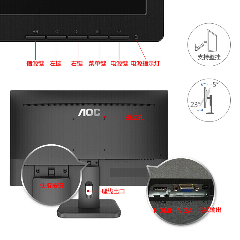 19.5WLED,TN,快拆支架;5ms,200nits,VGA*1、HDMI1.4*1,音频输出,对比度600:1(静态)2000万:1(动态),1600*900;不闪屏,低蓝光设置;支持i-Menu调节软件;支持e-Saver管理软件,智能关机;支持VESA壁挂;认证:节能/环境标志/TUV低蓝光。