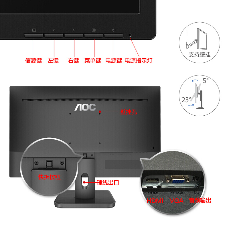 22.5AH-IPS,1.5mm窄边框,快拆支架;5ms,250nits,VGA*1、HDMI1.4*1,音频输出,对比度1000:1(静态)2000万:1(动态),1920*1200;不闪屏,低蓝光设置;支持i-Menu调节软件;支持e-Saver管理软件,智能关机;支持VESA壁挂;认证:节能/环境标志/TUV低蓝光/能源之星。