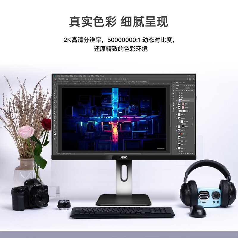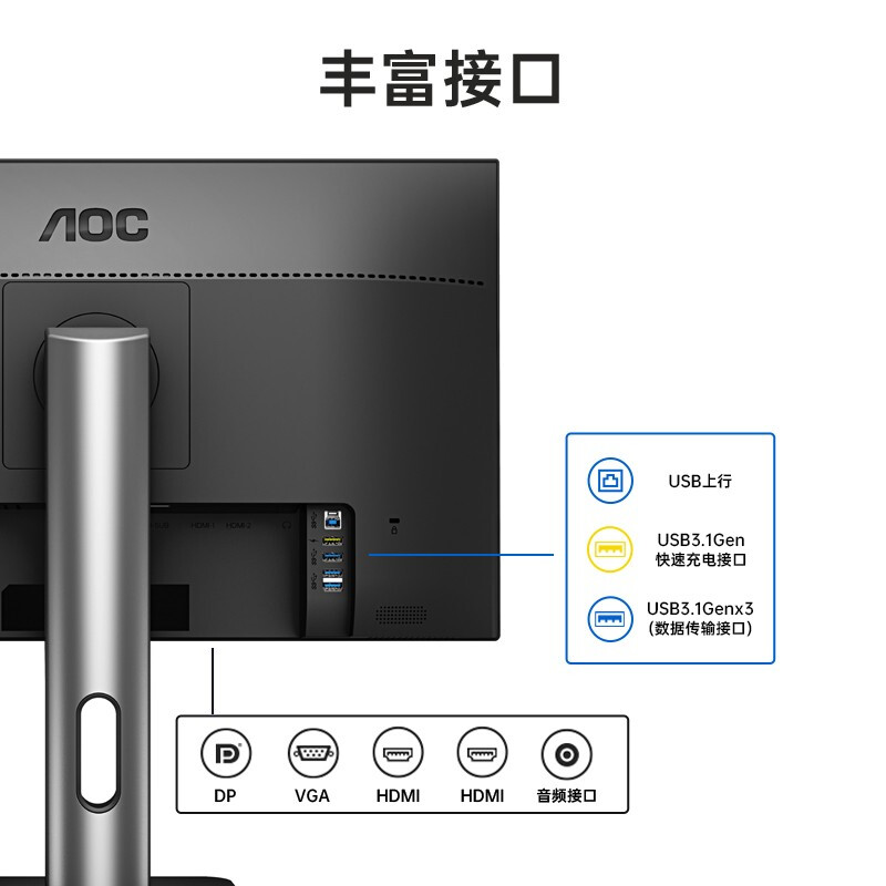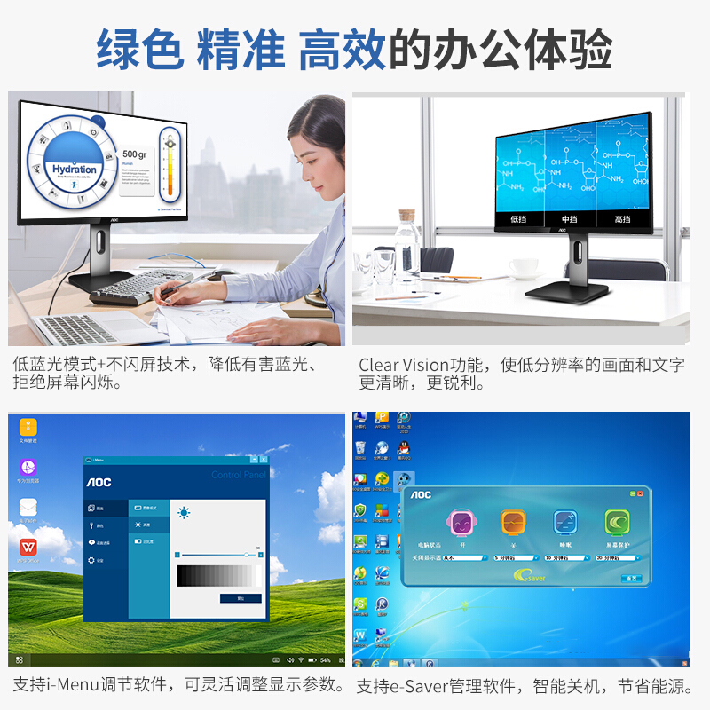 23.8IPS技术2K广视角炫彩硬屏,升降旋转,1.5mm窄边框,快拆支架;5ms,250nits,VGA*1、HDMI1.4*2、DP1.2*1、USB3.2Gen13(蓝色接口)、USB3.2Gen1快速充电接口1(黄色接口)、音频输出;DCR>50000000:1,2560x1440QHD分辨率,色彩精准度E<2(平均值);不闪屏,低蓝光设置;支持i-Menu调节软件;支持e-Saver管理软件,智能关机;支持VESA壁挂;认证:CCC/节能/TUV低蓝光/环境标志。