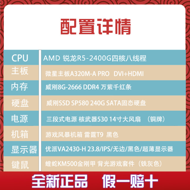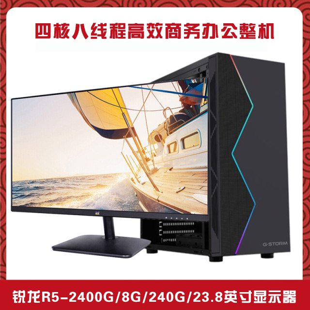 【R5-2400G整机】AMD 锐龙2400G四核/8G内存/240G硬盘/24寸高清液晶/ 键鼠全套整机