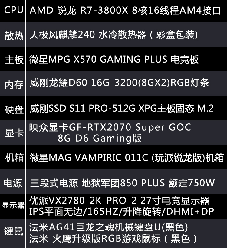 【R7-3800X整机】锐龙 R7 3800X/16G内存/512G固态/优派VX2780-2K-PRO-2 27寸电竞游戏整机