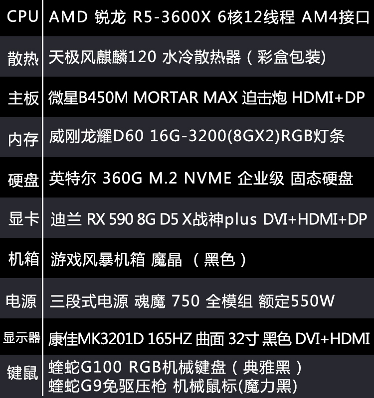 【R5-3600X整机】锐龙 R5 3600X/16G内存/360G固态/康佳MK3201D 32寸曲面电竞游戏整机