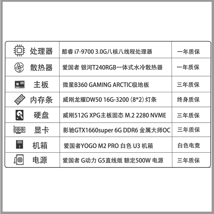 【i7-9700白色主机】酷睿i7-9700/16G内存/512G固态/1660s独显白色方案游戏电竞主机