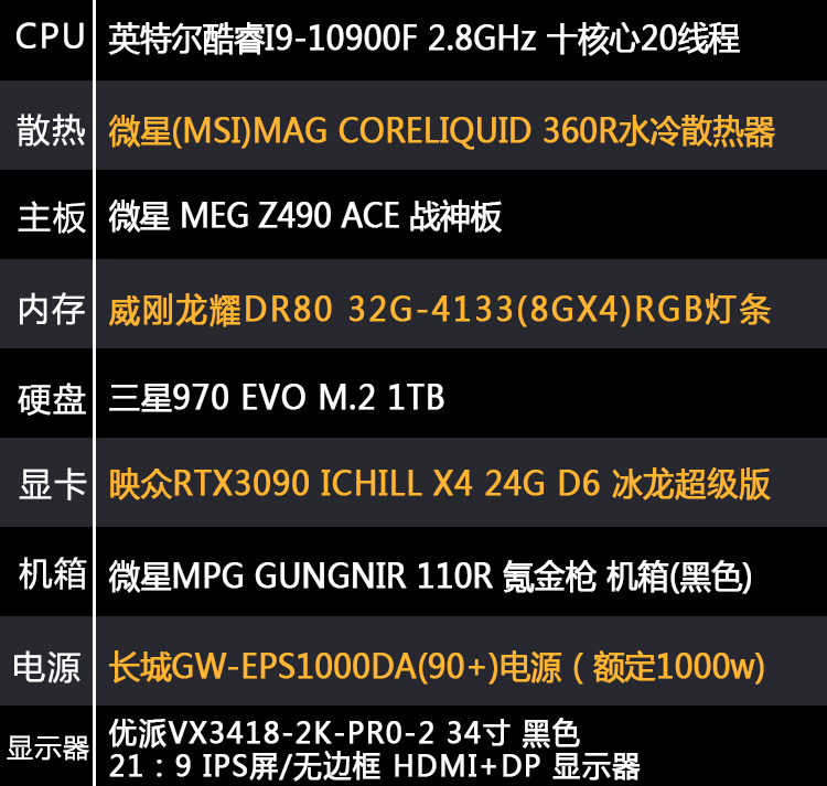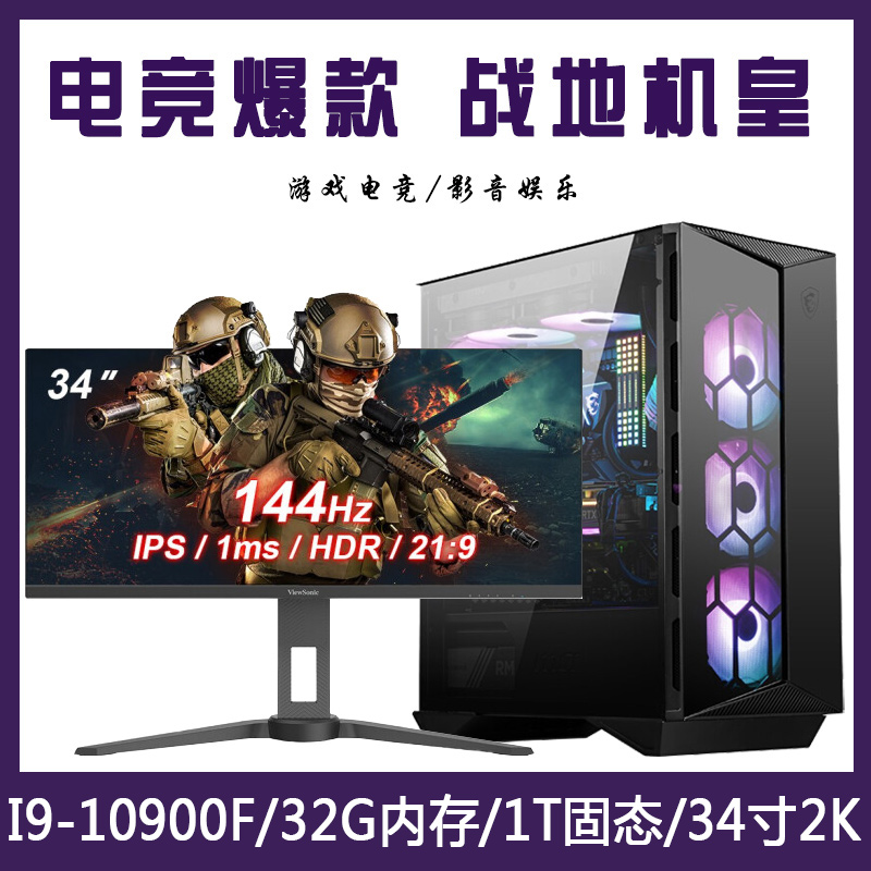 【i9-10900F整机】酷睿i9-10900F/32G内存/1T固态/优派34寸电竞显示器24G独显办公游戏电竞组装电脑