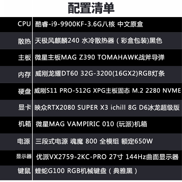 【i9-9900K整机】酷睿i9-9900K/16G内存/512G/RTX2080/优派27寸电竞显示器整机