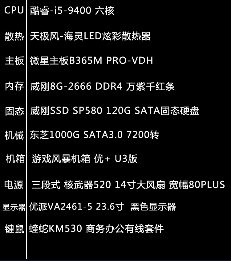 【i5-9400整机】酷睿i5-9400/8G内存/120G固态/1T机械/优派VA2461-5 23.6寸办公整机