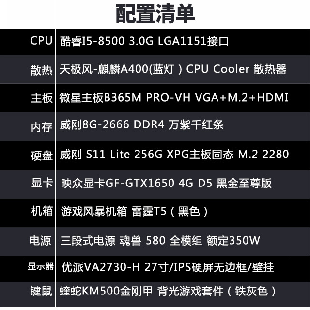 【i5-8500整机】i5-8500/8G内存/256G固态/1650-4G显卡/优派 27寸显示器 组装机