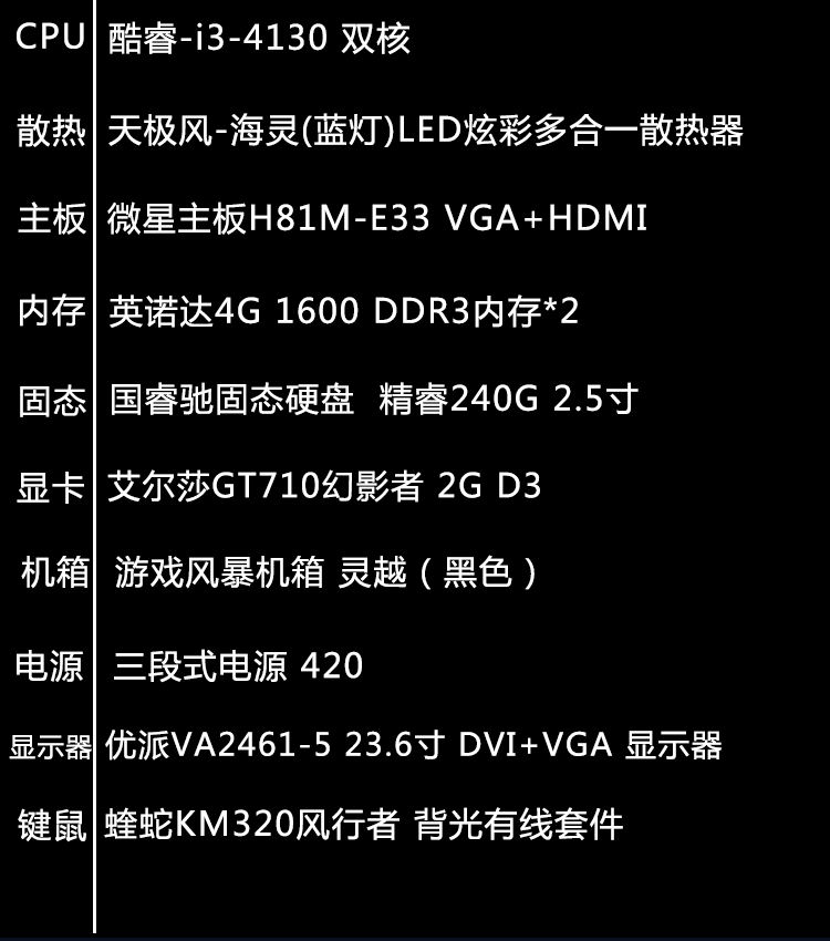 【i3-4130整机】酷睿i3-4130/8G/240G/GT710 2G/优派23.6寸家用影音办公整机