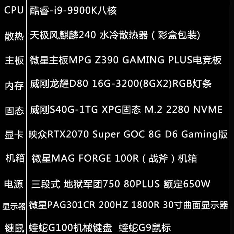 【i9-9900K整机】酷睿i9-9900K/16G内存/1T固态/RTX2070/微星30寸电竞显示器整机
