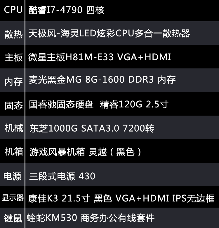 【i7-4790整机】酷睿i7-4790四核/8G内存/120G固态/1T机械/21.5寸高清显示器整机