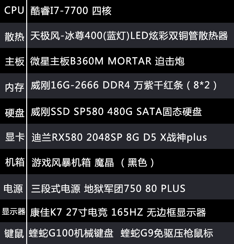 【i7-7700整机】酷睿i7-7700/16G内存/480G固态/康佳K7 27寸电竞165HZ电竞游戏整机