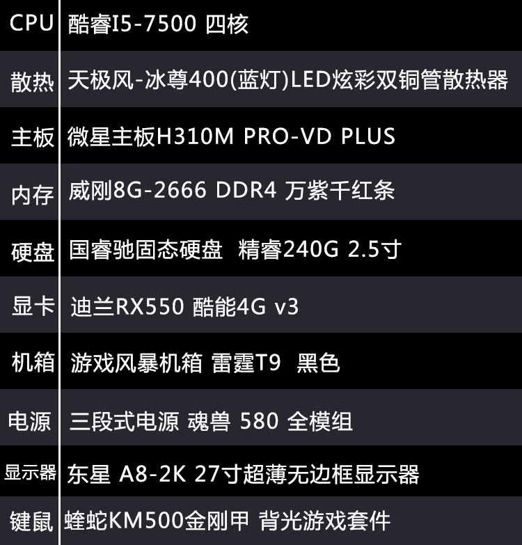 【i5-7500整机】酷睿i5-7500/8G内存/240G固态/东星A8-2K无边框27寸显示器