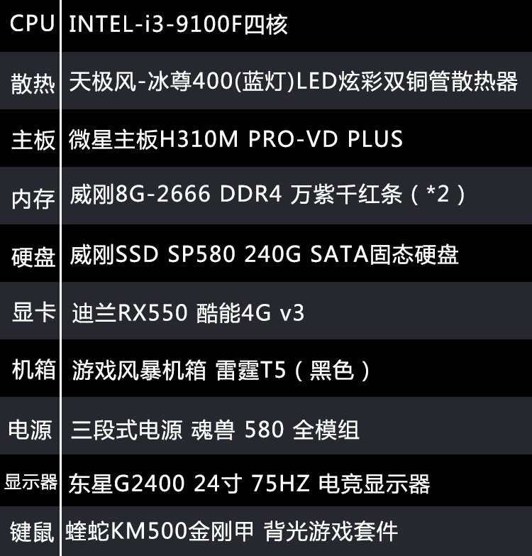 【i3-9100F整机】酷睿i3-9100F/16G内存/240G固态/东星G2400无边框电竞24寸显示器