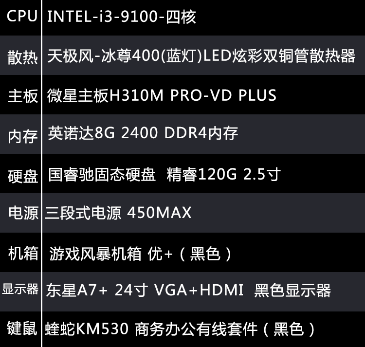 【i3-9100整机】i3-9100/8G内存/120G固态/东星A7+无边框24寸显示器组装