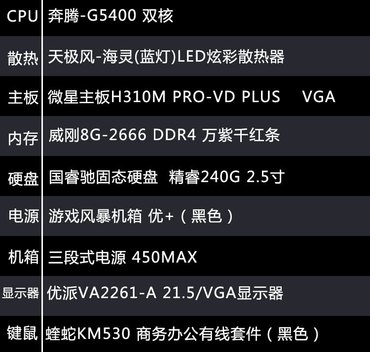 【G5400整机】奔腾G5400/8G内存/240G固态硬盘/优派21.5寸高清显示器键鼠全套办公整机
