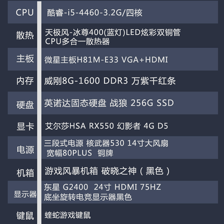 【i5-4460整机】酷睿I5-4460-3.2G四核/8G/256G固态/4G显卡/键鼠机电/24寸电竞争液晶全套整机