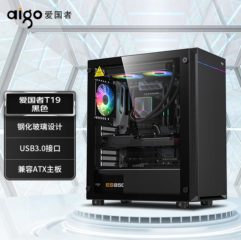 爱国者(aigo)T19 黑色 玻璃侧透台式机电脑主机箱(ATX主板/360水冷位/4硬盘位/6风扇位)