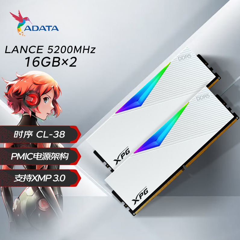 威刚XPG LANCER 32G(16G2) DDR5 5200 釉白内存条 电竞RGB灯条