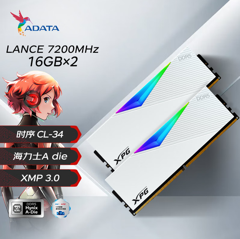 威刚XPG 龙耀 LANCER 32G(16G*2) DDR5 7200 时序CL34 海力士A die颗粒釉白电竞RGB内存条