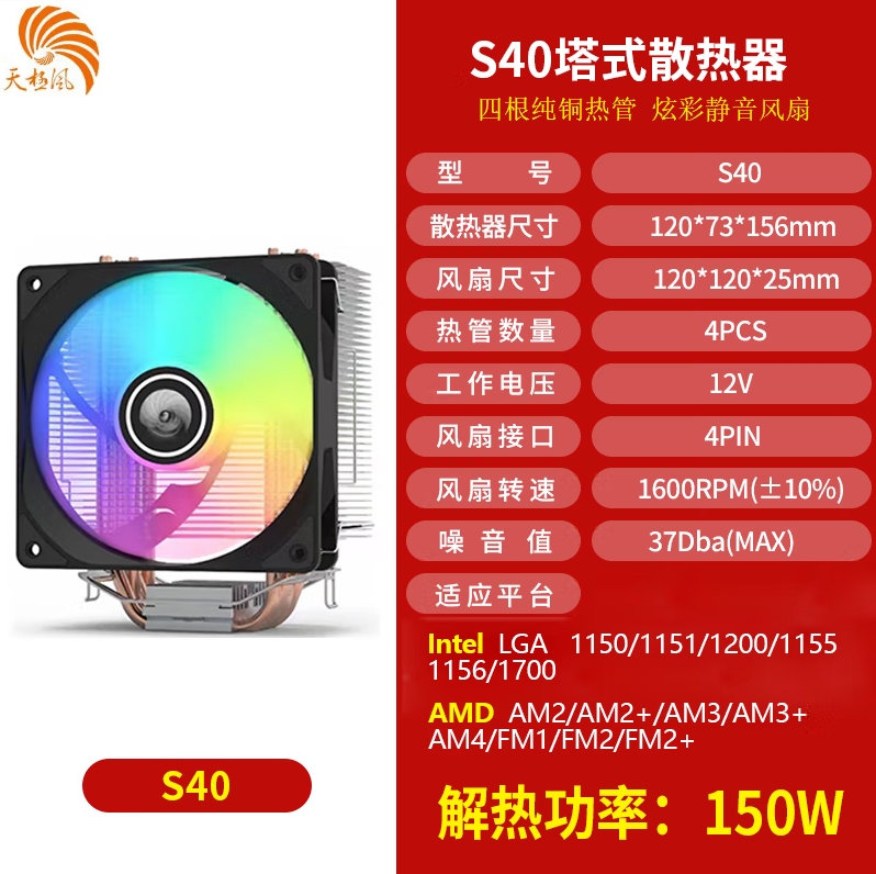 天极风 S40 炫彩版 四铜管CPU散热器