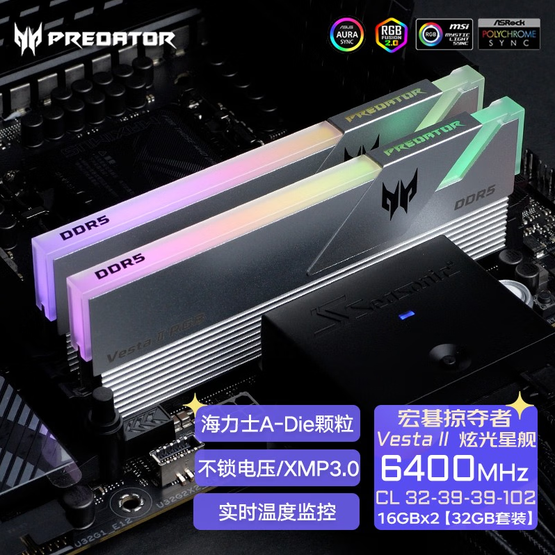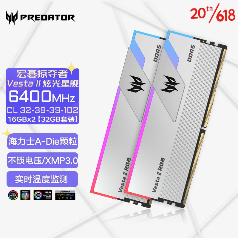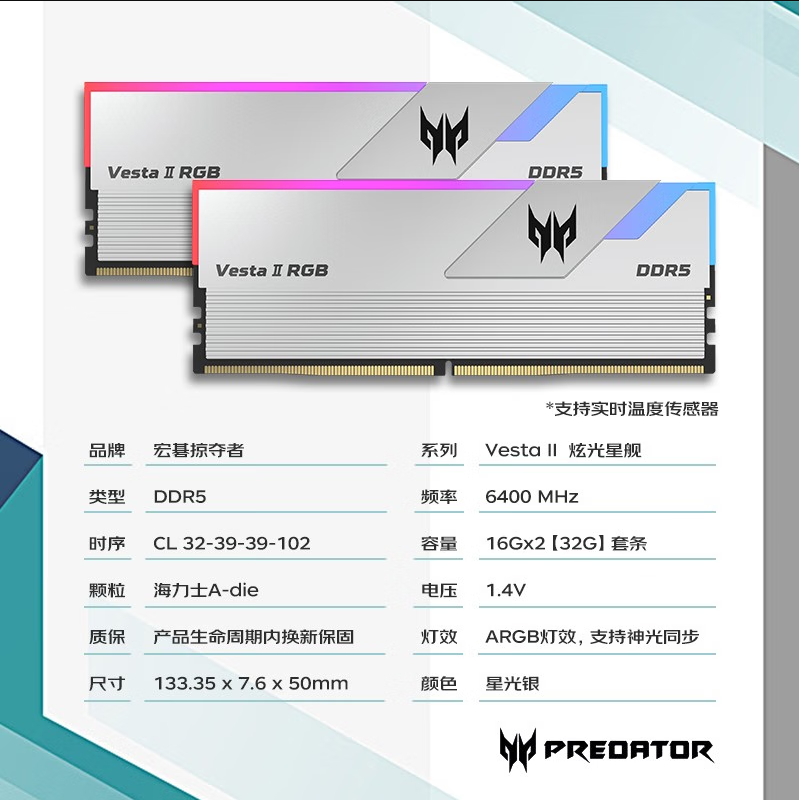宏碁掠夺者(PREDATOR)炫光星舰 6400 32G(16G×2) DDR5银色内存 A-die超频颗粒 电竞游戏高频RGB灯条 内存条批发