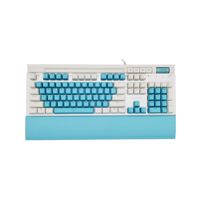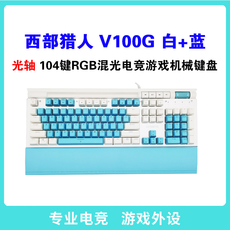 西部猎人 V100G 光轴(白+蓝)专业电竞游戏有线机械键盘 独家私模 带多媒体按键 宏定议编程 托盘 手机支架 RGB混光 云南键盘批发