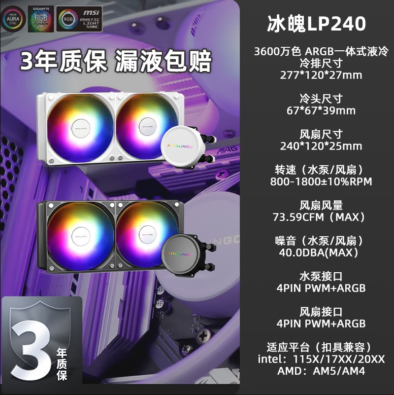爱国者(aigo)冰魄LP240黑色一体式水冷 CPU散热器(ARGB光效/免拼接风扇/陶瓷轴心)