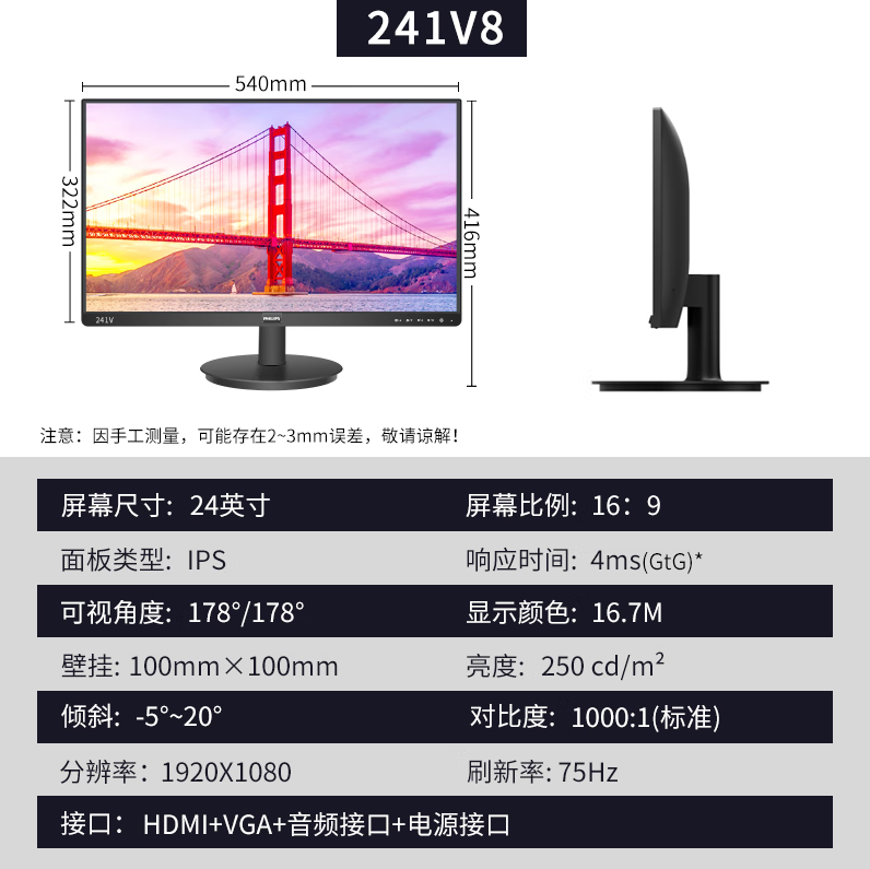 飞利浦241V8 23.8英寸电脑显示器 1080P全高清 VA广视角 75Hz 高清家用办公可壁挂 HDMI+VGA接口