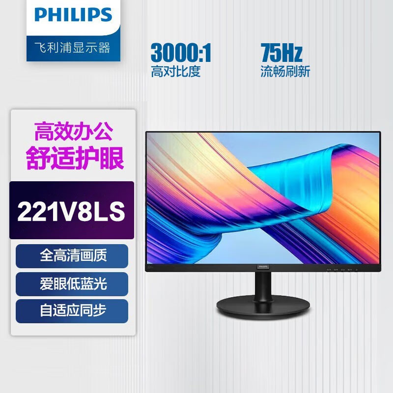 飞利浦(PHILIPS)221V8LS 21.5英寸 全高清 护眼 IPS液晶屏 低蓝光 75Hz刷新 窄边框家用办公电脑显示器