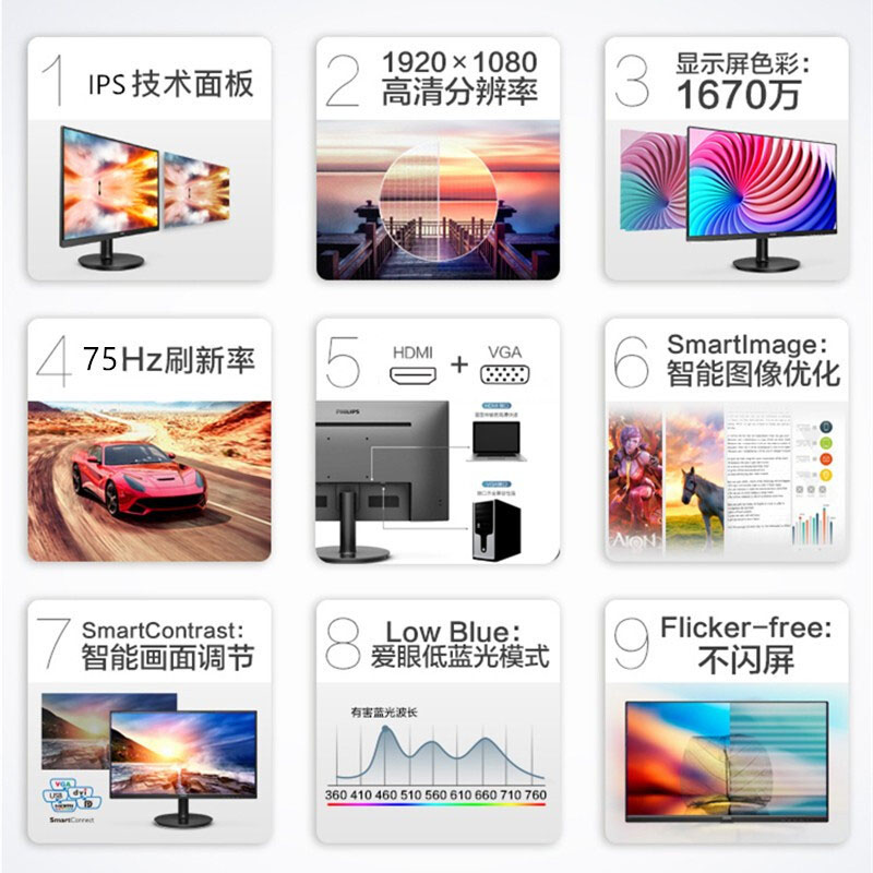 飞利浦(PHILIPS) 271V8B 27英寸 IPS屏 广视角 低蓝光不闪屏 窄边框可壁挂 100Hz液晶显示器