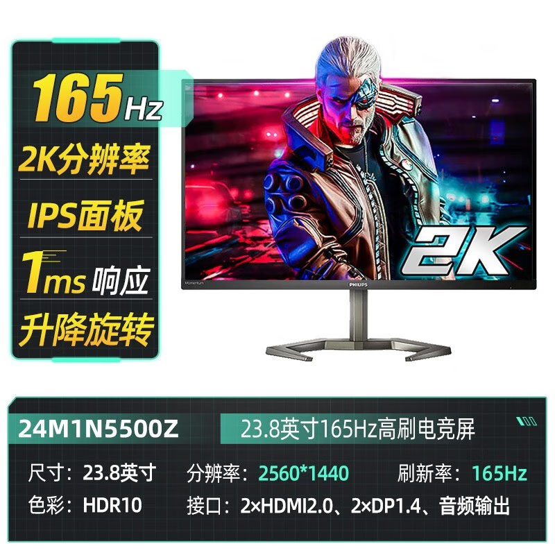 飞利浦(PHILIPS)24M1N5500Z 23.8寸 2K 165Hz电竞显示器 旋转升降支架 1MS响应IPS电竞游戏屏