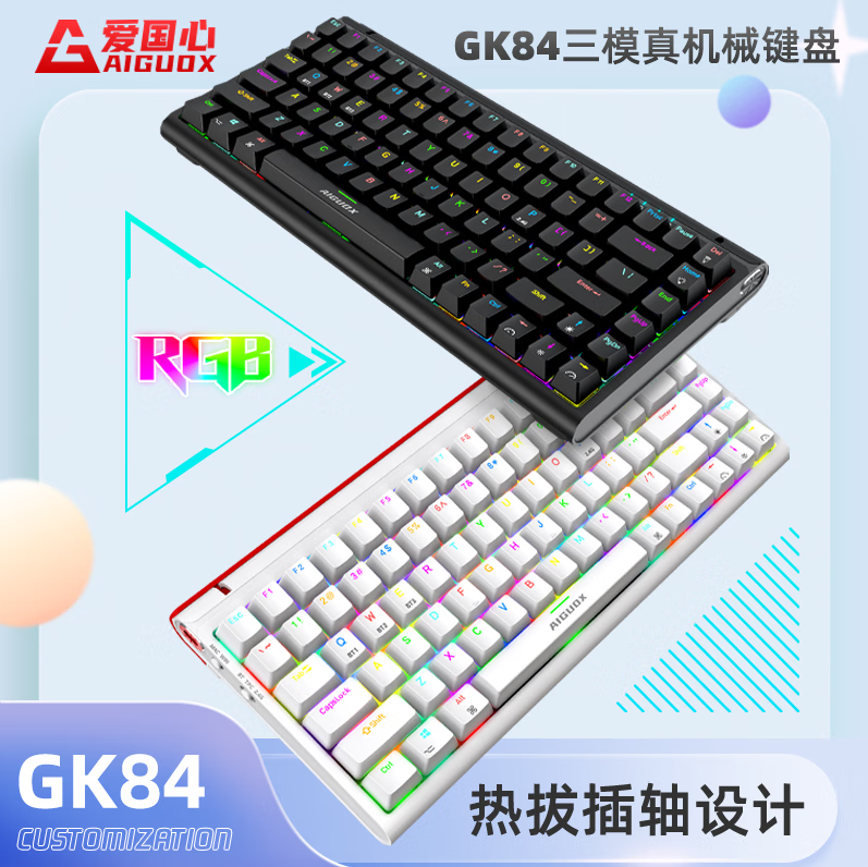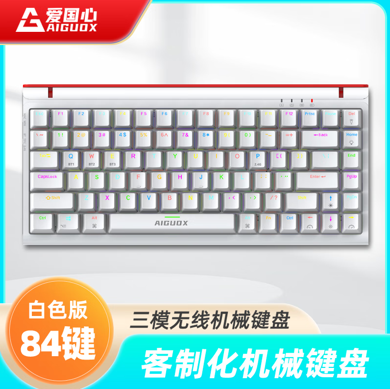 爱国心 GK84 白色青轴 有线无线三模2.4G蓝牙机械键盘热插拔轴体 RGB幻彩灯光客制化机械键盘84键PBT键帽