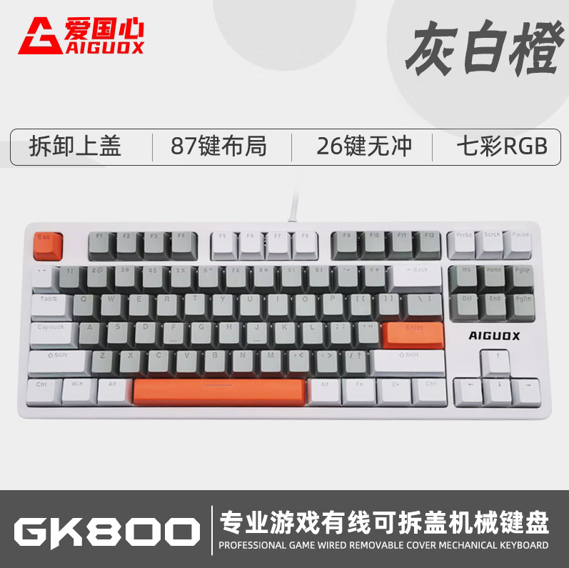 爱国心 GK800 灰+白+橙 青轴 有线游戏机械键盘 RGB背光 可拆卸上盖 87键 电脑笔记本办公