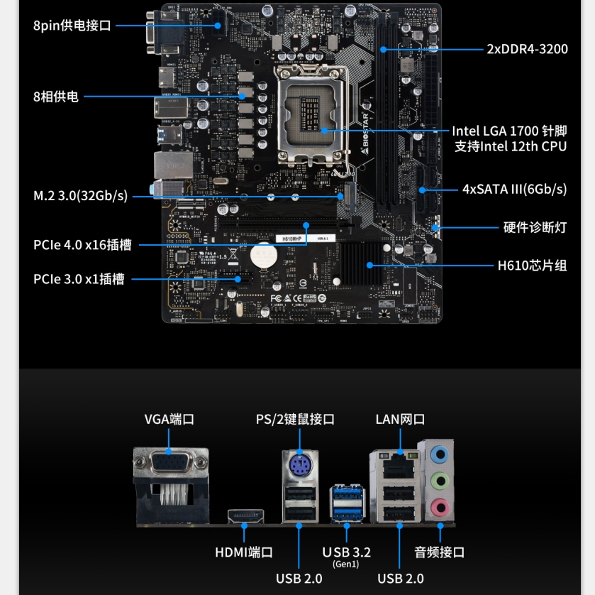 映泰(BIOSTAR)H610MHP 2.0电脑主板支持13400/12100/12400/13600k